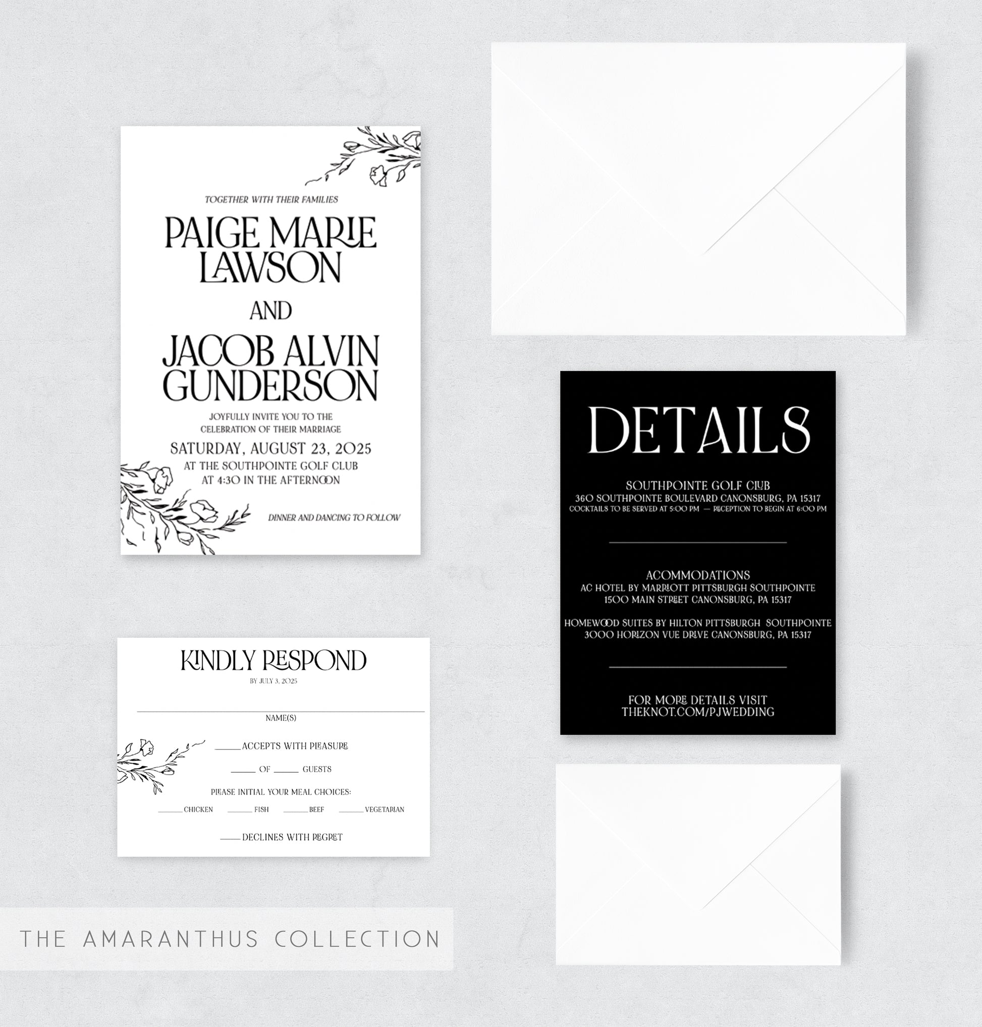 Details cards, envelope liners, or any other pieces can be added on during the proofing process for an additional cost. All of our envelope and print colors are customizable to match your style and vision for your Wedding! Add-ons and embellishments can include venue sketches, colored envelopes, custom watercolors, wax seals, belly bands, calligraphy etc.